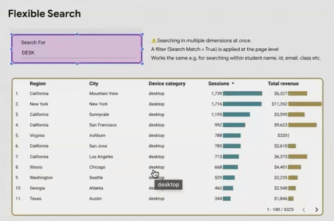 CONTAINS_TEXT( LOWER(CONCAT(Region, City, Device Category)), LOWER(Search For) )This concatenates multiple fields together, converts everything to lowercase (making the search case-insensitive), and returns TRUE when it finds a match