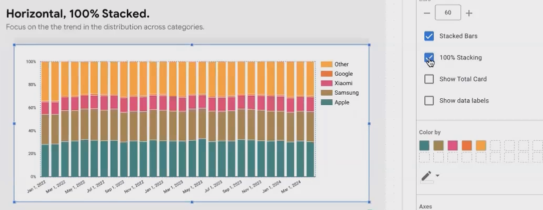 To enable 100% stacking: Select your area chart → Style tab → Check "Show stack" → Check "100%"The 100% stacked area chart is particularly valuable when you want to focus on how the distribution itself changes over time without being distracted by the overall trend magnitude.