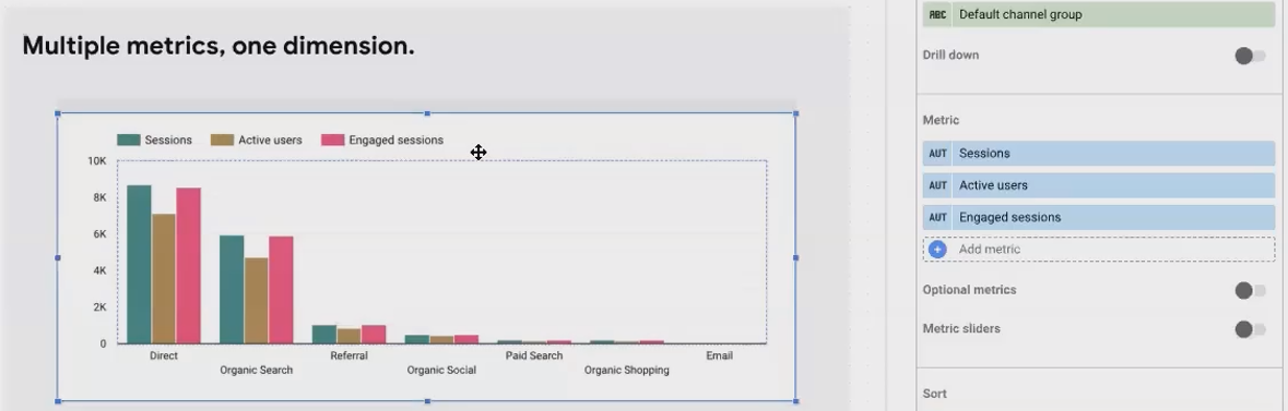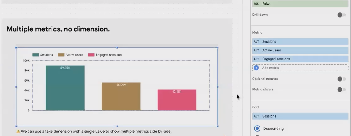 Note: You can't have both multiple metrics AND a breakdown dimension simultaneouslyUsing the fake dimension trick again, you can also compare multiple metrics in aggregate without any dimension breakdown: