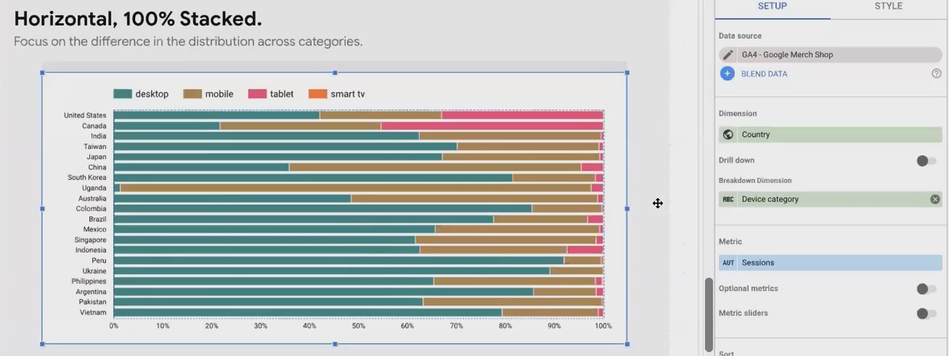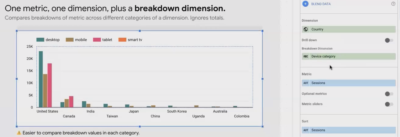 You can enhance bar charts by adding a breakdown dimension. For example, showing sessions per country, broken down by device category: