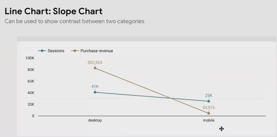 For example, comparing purchase revenue and sessions between desktop and mobile: