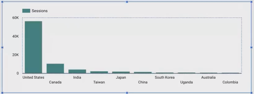 For instance, you could create a line chart with countries on the x-axis and sessions as the metric: