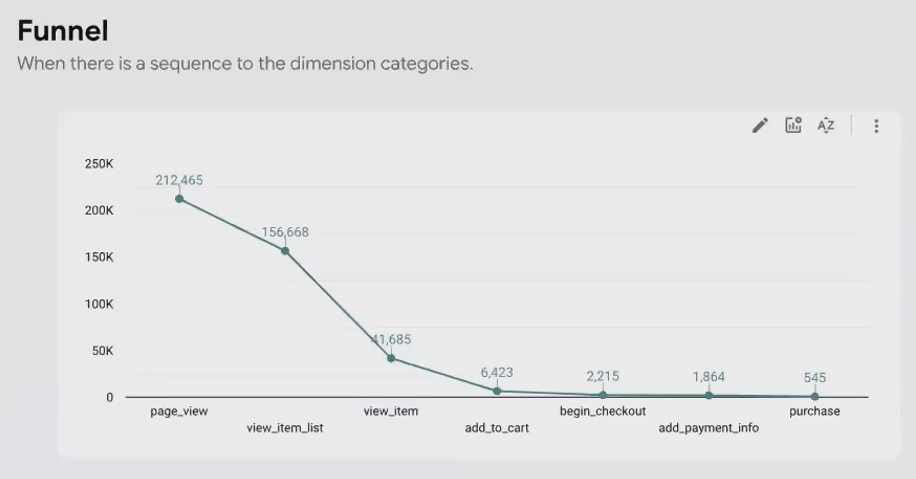 Unlike random categories, funnel steps have an inherent order (session → page view → list view → item view → add to cart → checkout → payment → purchase). This natural progression makes the continuity implied by a line chart appropriate and meaningful.