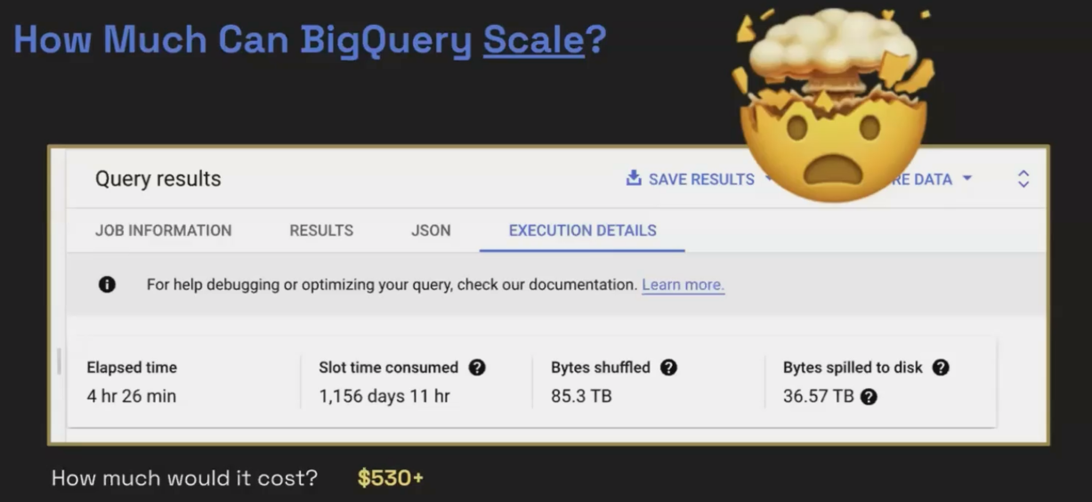 BigQuery achieves its speed by spreading your query across hundreds or thousands of virtual CPUs simultaneously. When I ran a query on a 19-million-row dataset (with 60 columns), BigQuery completed it in under 2 minutes by using what would have been 29 minutes of processing time on a single CPU.