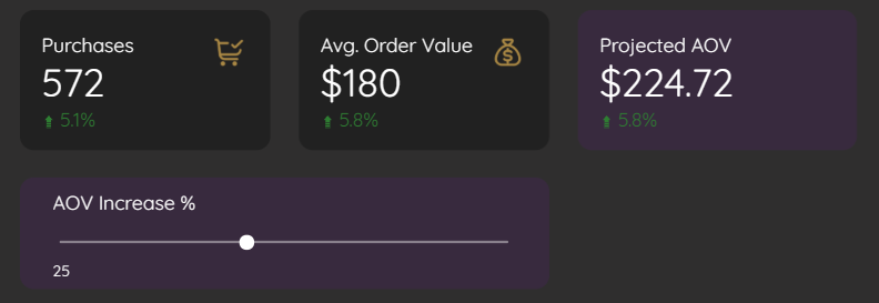 This setup allows users to adjust the slider and immediately see the projected impact on AOV and revenue, creating an interactive forecasting tool within your dashboard.