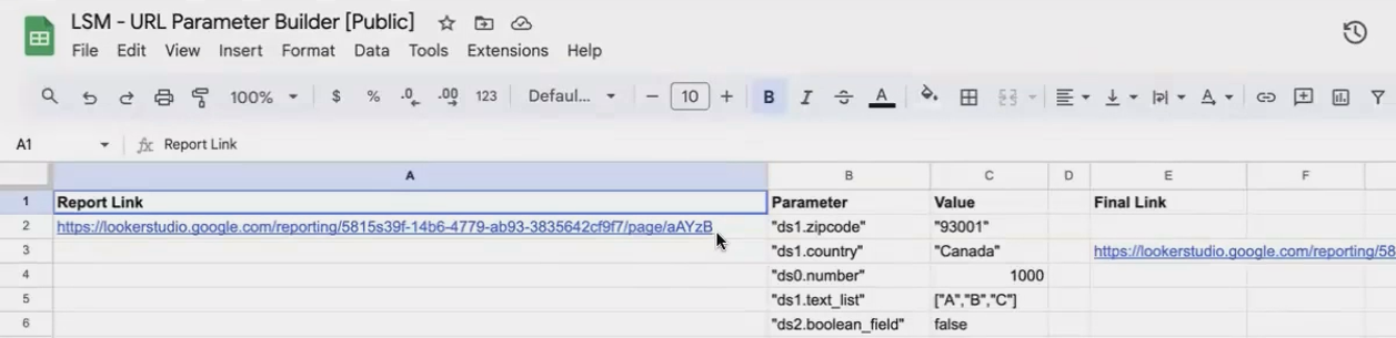 https://lookerstudio.google.com/reporting/report-id?params=%7B%22lat%22%3A40.7128%2C%22lon%22%3A-74.006%2C%22distance%22%3A5%7DTo simplify this process, I've created a Google Sheet template that generates these URLs automatically. Just enter your base report URL and parameter values, and it produces a ready-to-use link.