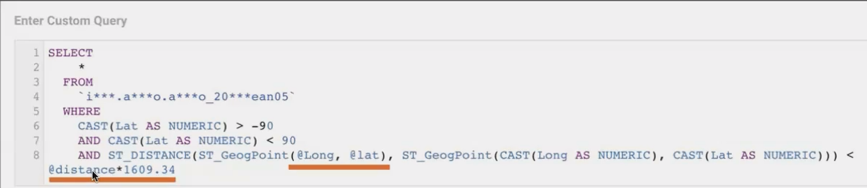 This query finds all locations within a specific distance (converted from miles to meters) of the point defined by the latitude and longitude parameters.