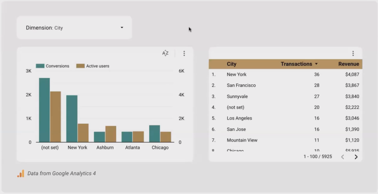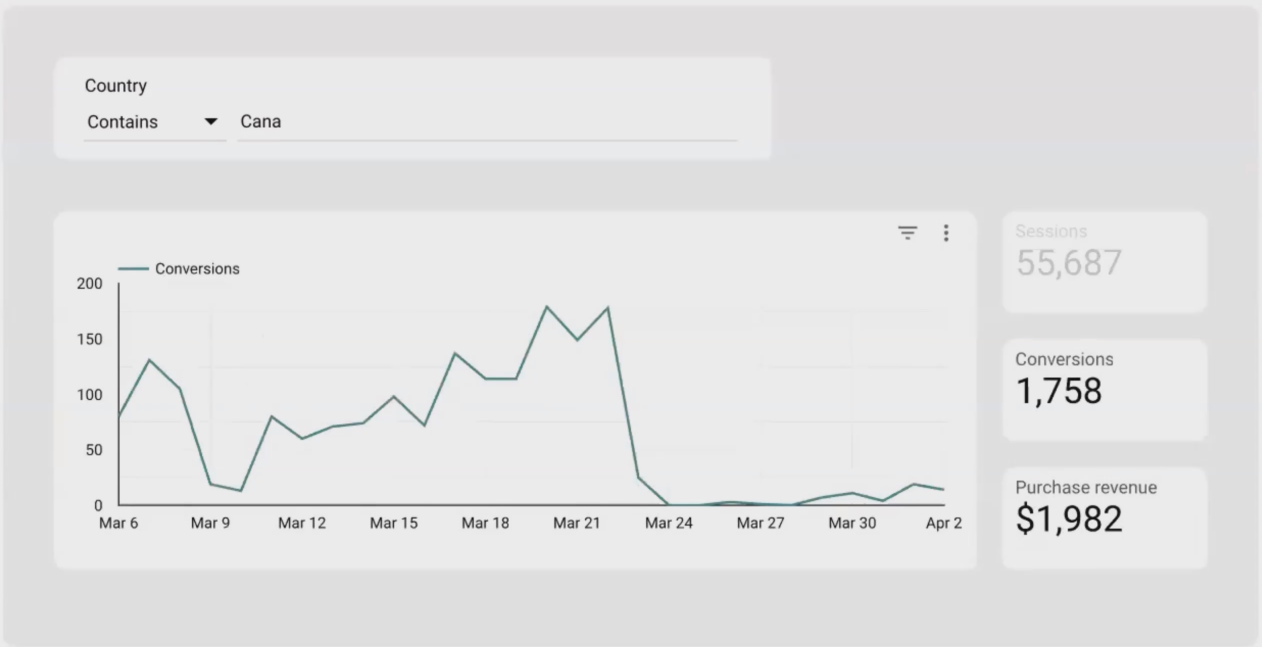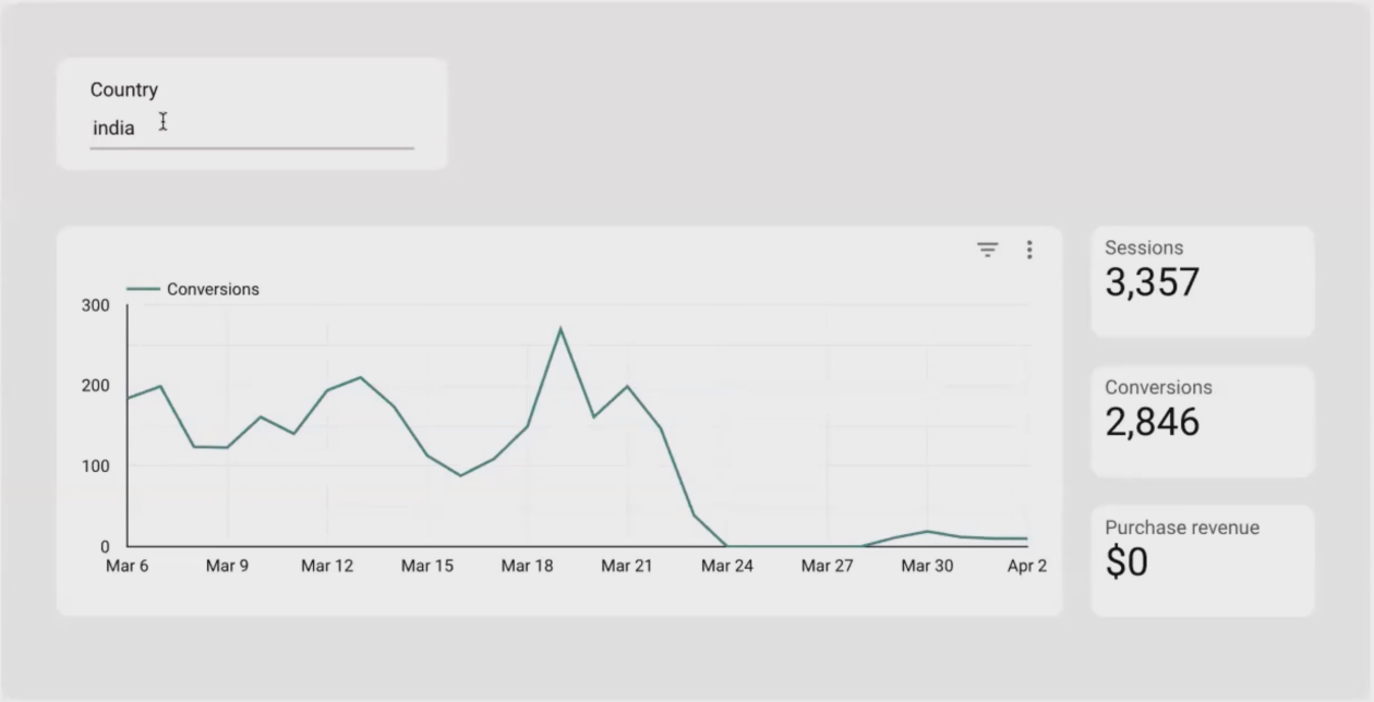 Let's say you have a bar chart showing "Conversions by Country." With a Dimension Control, your viewers can switch from viewing by Country to viewing by Device Category, Browser, City, or any other dimension you make available to them.