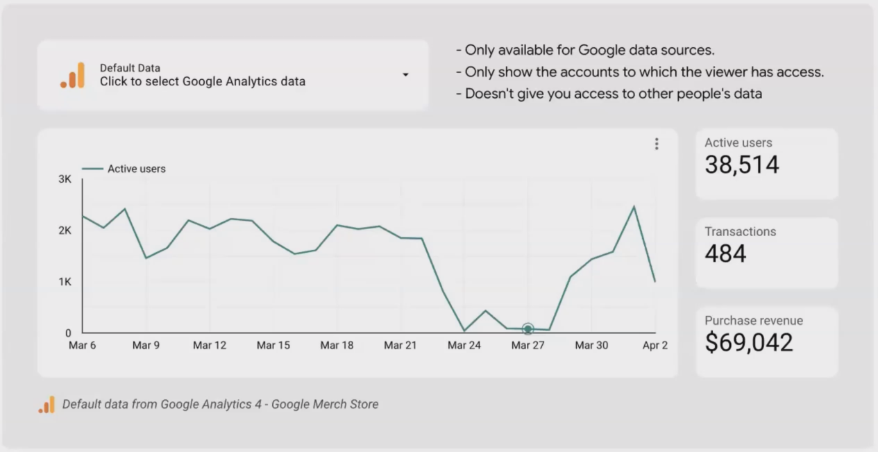 When you create a report, you connect it to a specific data source (e.g., the Google Analytics 4 property for the Google Merchandise Store). With a Data Control, viewers can switch to any compatible data source they have access to.