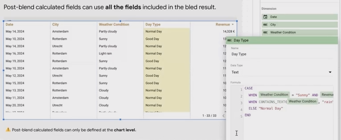 ENDThis calculation uses the Weather_Condition field from our weather data and the Revenue field from our sales data – something impossible without blending!