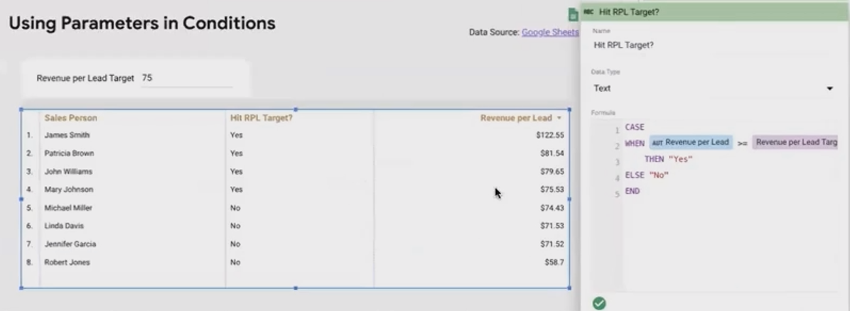 Now your report viewers can adjust the target threshold themselves, and your visualization will update in real-time to show who meets the new target.