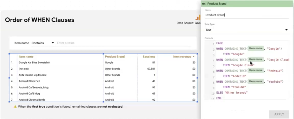 ENDThis looks logical at first glance, but there's a critical flaw: Any product containing "Google Cloud" in its name also contains "Google" – meaning it will be categorized as "Google" because that condition comes first and evaluates to true.