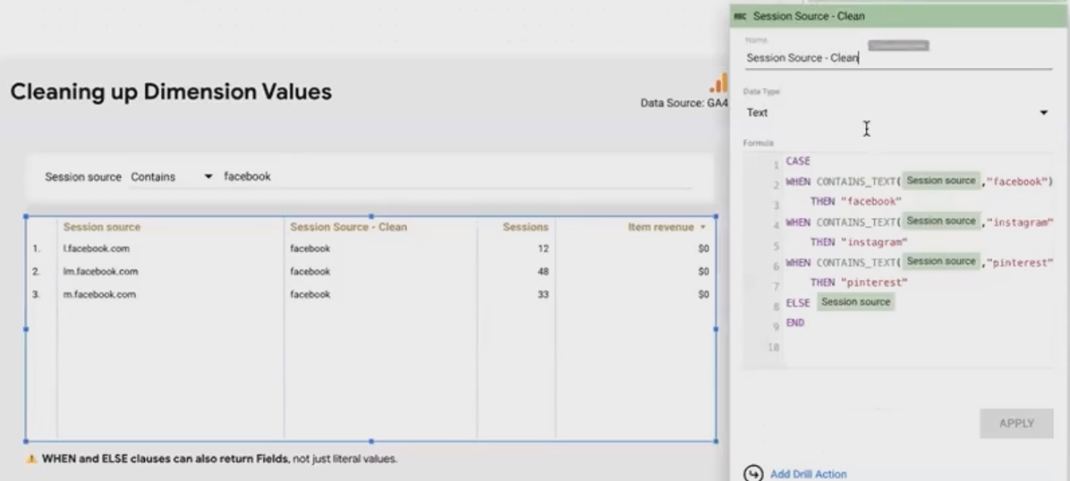 Notice the ELSE clause returns the original Session Source value for sources we're not explicitly cleaning up. This preserves important information while still consolidating the values we want to group.