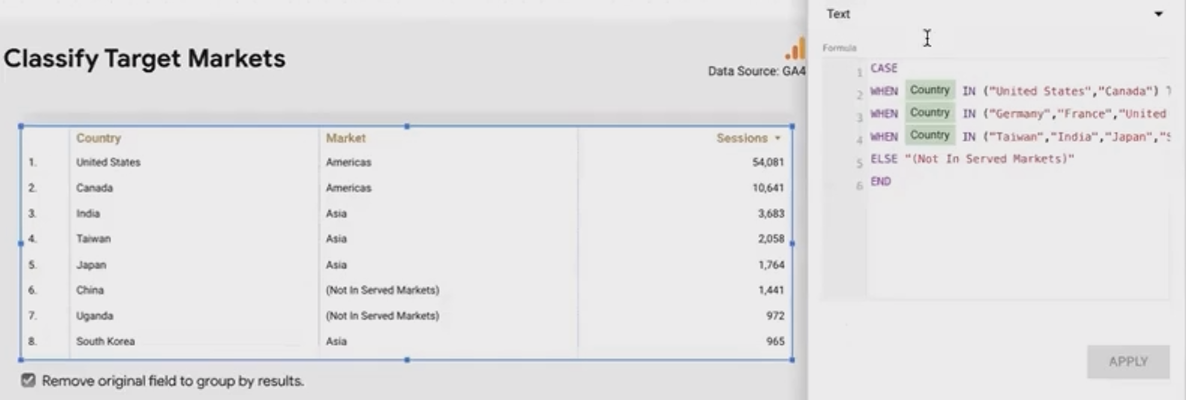 CASE is excellent for categorizing text fields based on multiple values. For instance, if you're analyzing global traffic, you might want to group countries into markets: