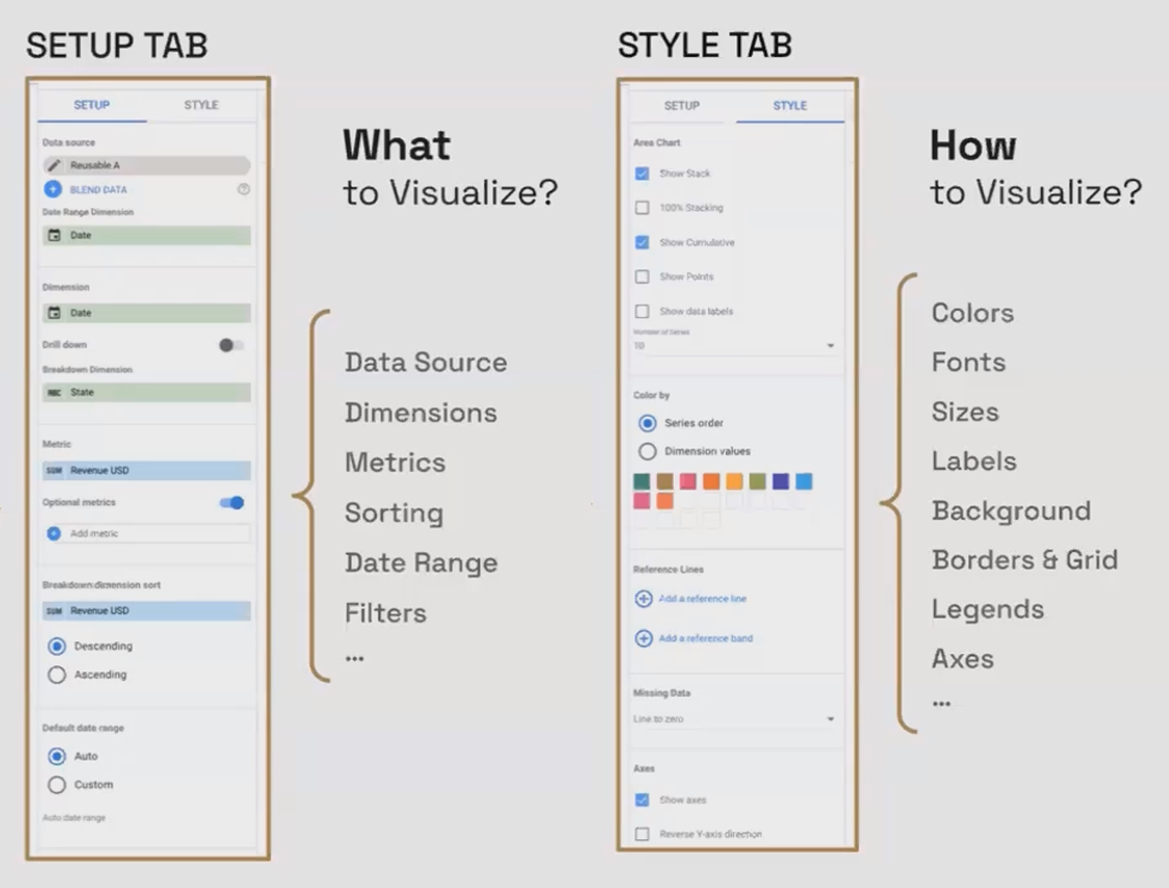Every chart in Looker Studio has two configuration tabs that separate the "what" from the "how":