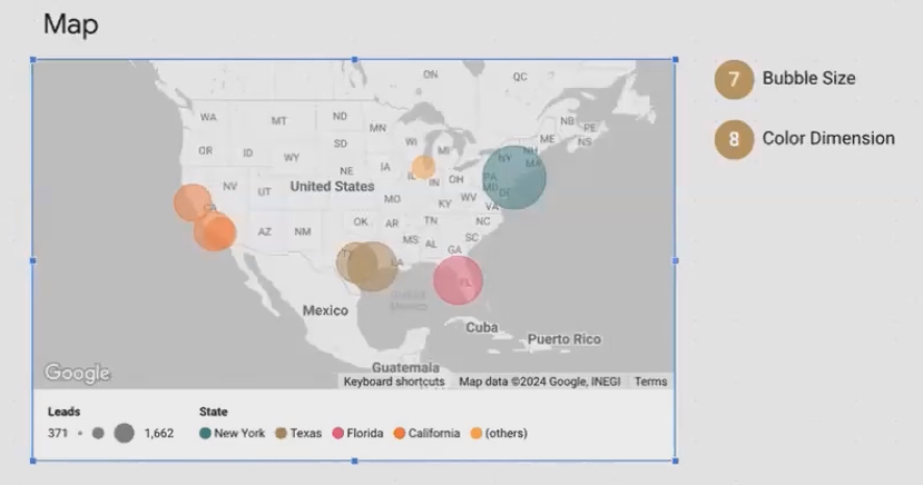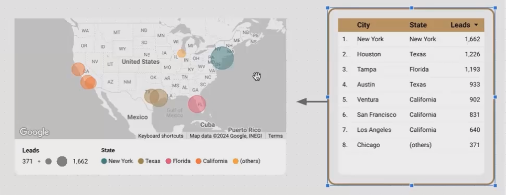 A bubble map showing leads by city, colored by state needs a table with: