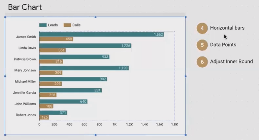Visualization Enhancement: By showing multiple metrics (leads and calls) for each salesperson, we can quickly identify who's converting their leads into calls effectively.