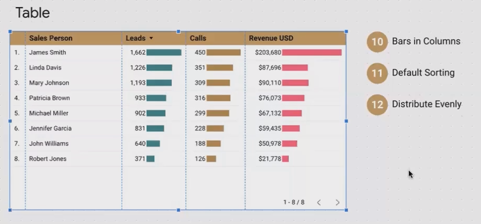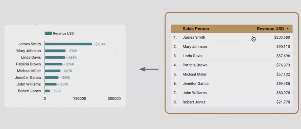 A horizontal bar chart showing revenue by salesperson is powered by a table with: