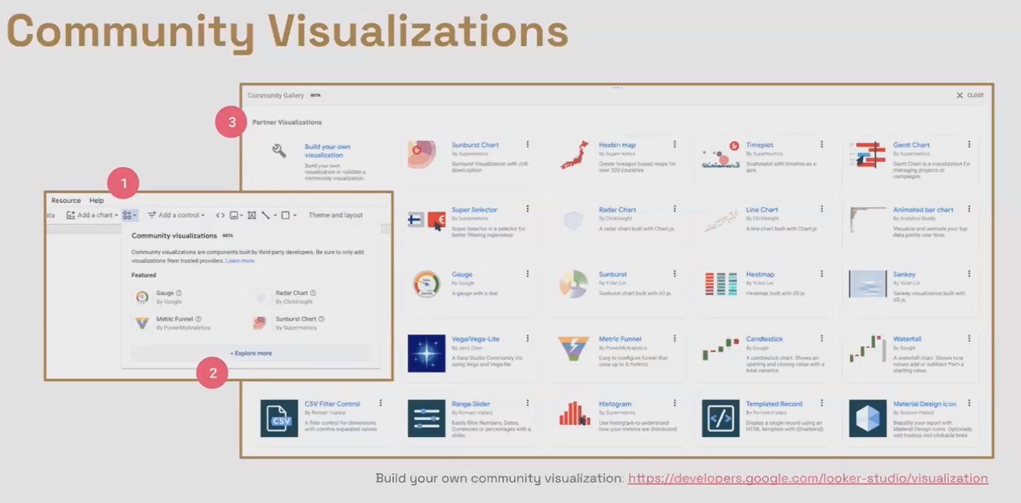 Community visualizations extend Looker Studio's capabilities with specialized chart types created by developers and shared with the community.