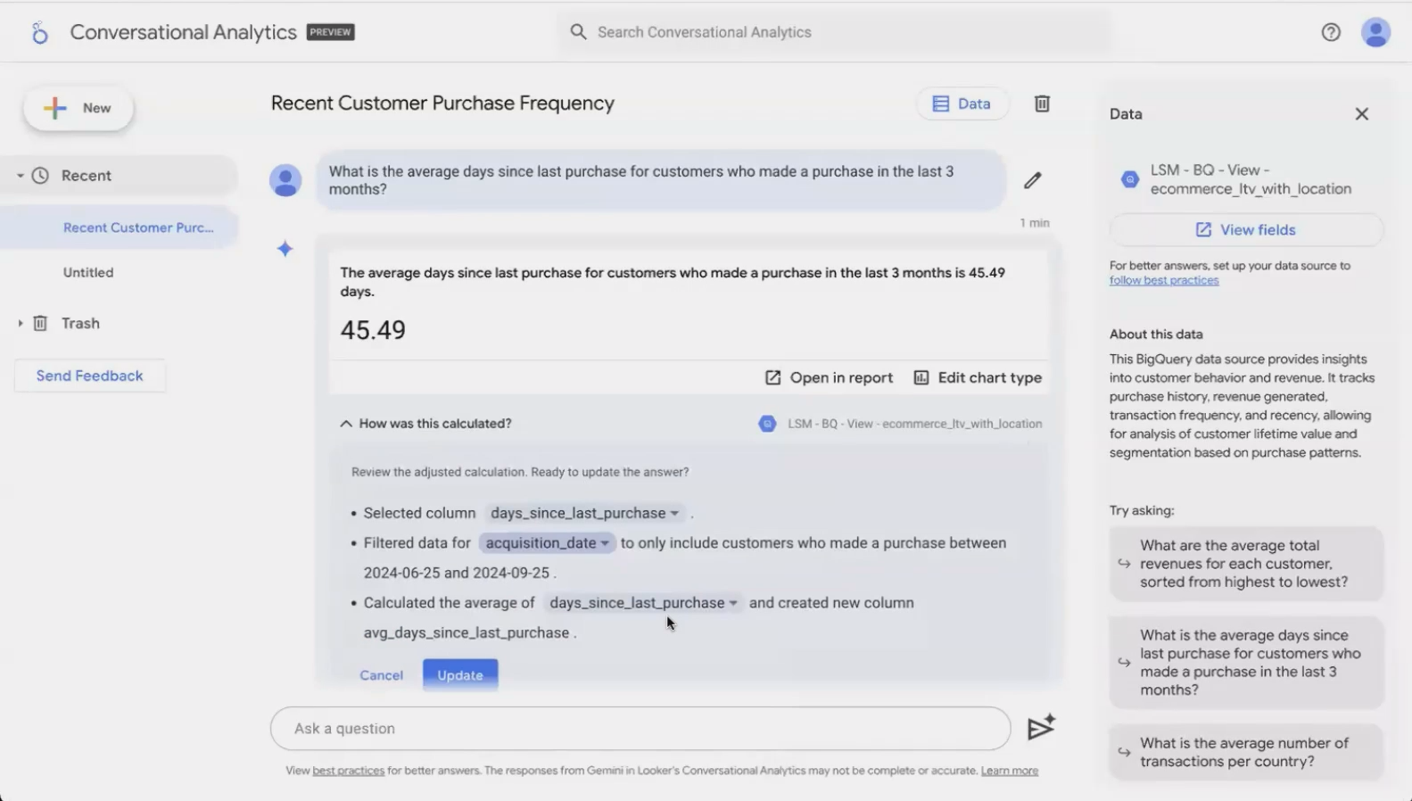 Conversational Analytics truly shines when exploring unfamiliar datasets or conducting ad-hoc analysis. Here are some practical scenarios where it excels:
