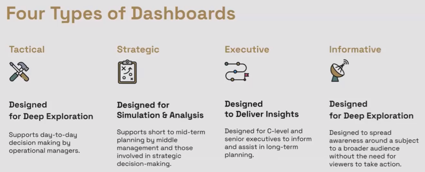 Understanding these four dashboard types: tactical, strategic, executive, and informative, provides a powerful framework for your dashboard planning process. By identifying which type best serves your users' needs before you start building, you'll create dashboards that truly deliver value.