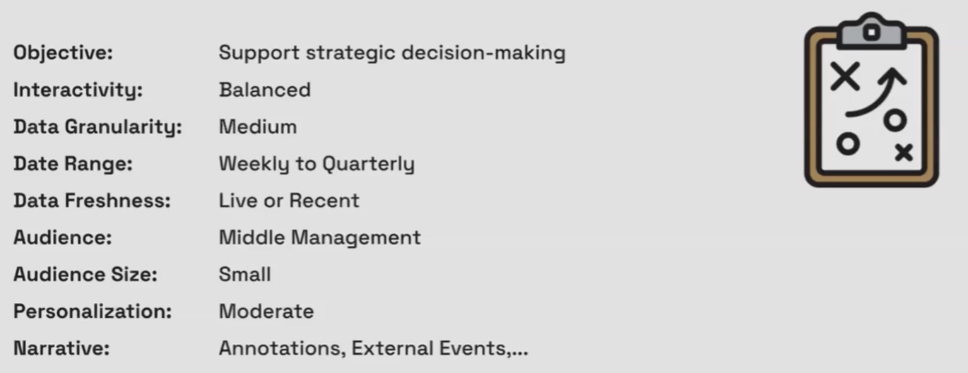 Weekly to quarterly views: Longer timeframes than tactical dashboards