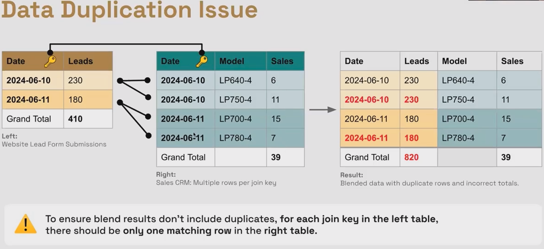 For example, if your left table has daily data, but your right table has daily data broken down by product, each day in your left table might match multiple products in your right table. Looker Studio will duplicate the left table's rows to accommodate all matches, potentially inflating your metrics.