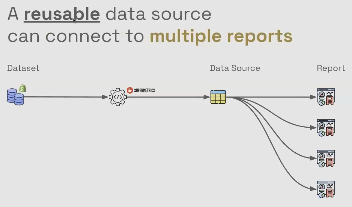 Conversely, you can also connect a single reusable data source to multiple reports. This approach offers significant advantages for teams and organizations that need consistent metrics across different dashboards.