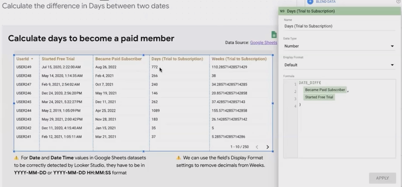 DATE_DIFF(Became Paid Subscriber, Started Free Trial)This gives us the number of days in the trial period for each user: