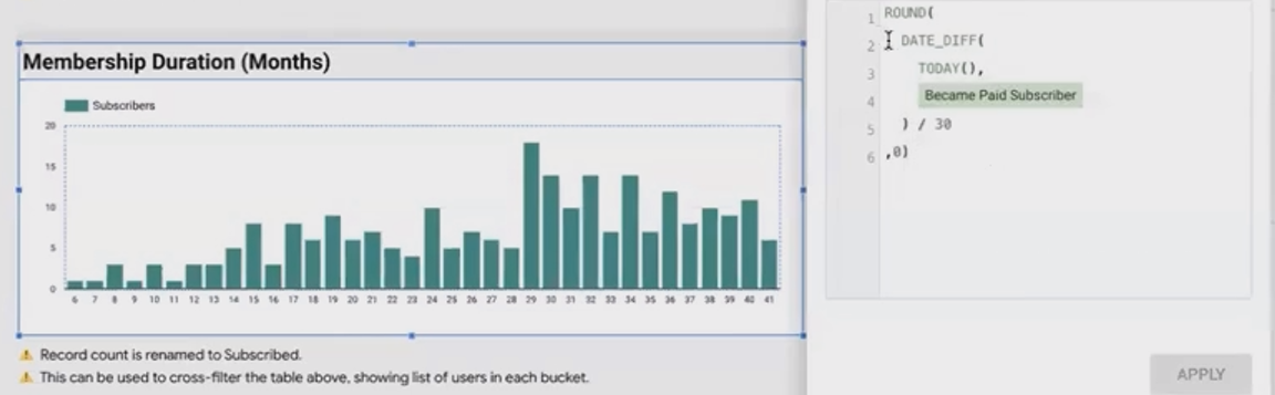 DATE_DIFF(TODAY(), Became Paid Subscriber) / 30Then, we round to create proper groupings: