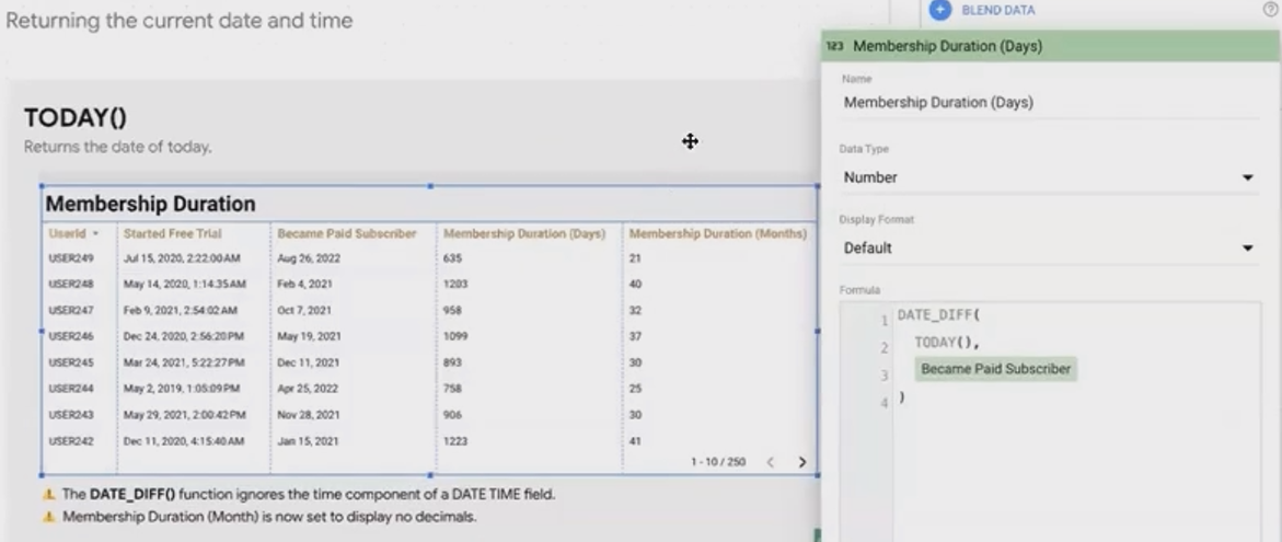 DATE_DIFF(TODAY(), Became Paid Subscriber)This formula gives us the number of days each customer has been a subscriber as of today: