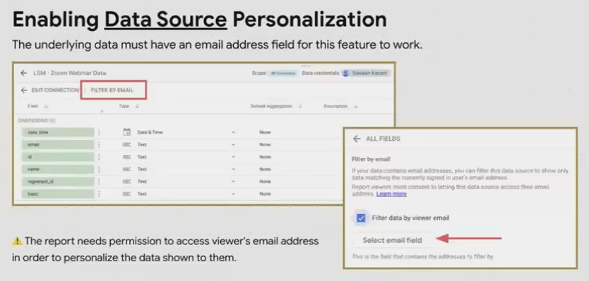 The Looker Studio interface for enabling email filtering on a data source, highlighting where to select your email field.