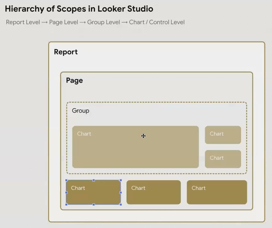 Think of your Looker Studio report as a series of nested containers, each with its own scope of influence. At the highest level is your entire report, followed by individual pages, then groups of components, and finally individual charts.