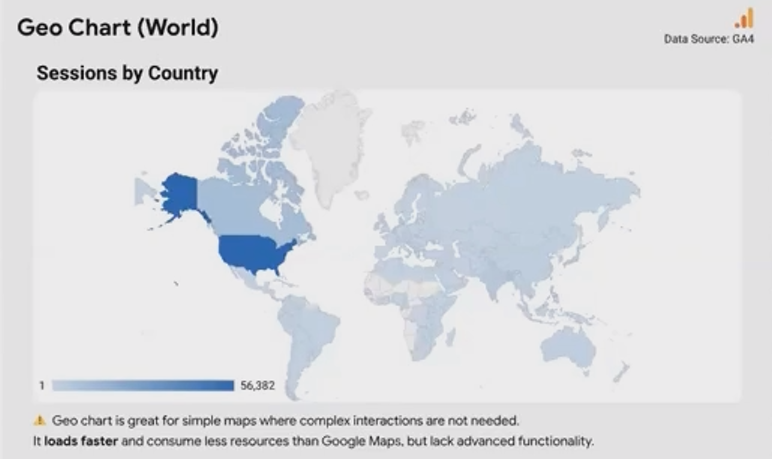 Geo Charts are Looker Studio's legacy map visualization tool. They've been part of the platform since its early days and provide a simple, lightweight way to visualize geographic data.