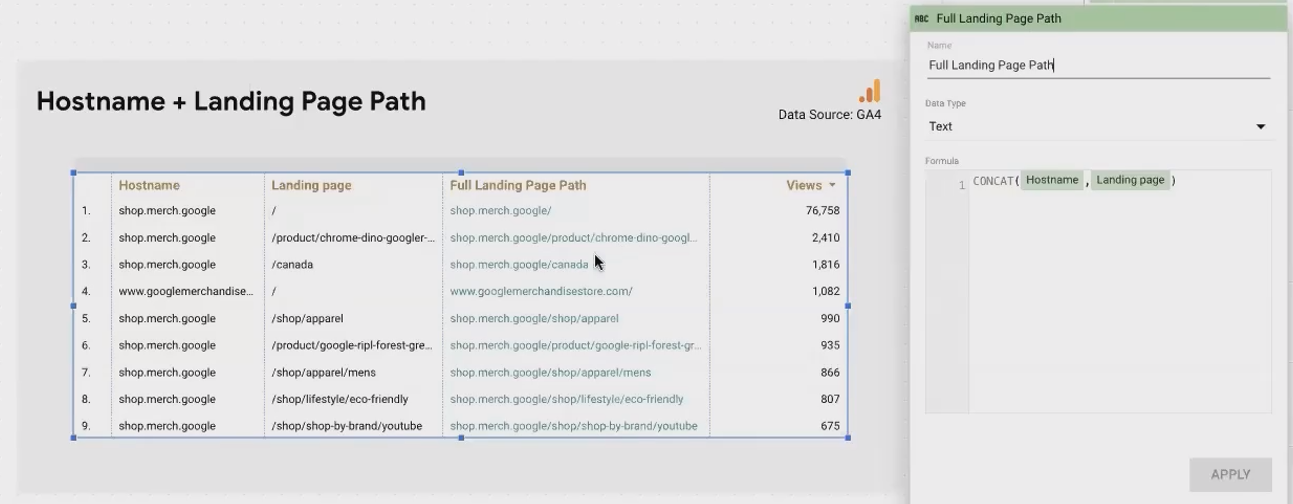 When working with Google Analytics 4 data, you'll often see that the hostname and page path are stored separately. To analyze the full URL, you need to combine them: