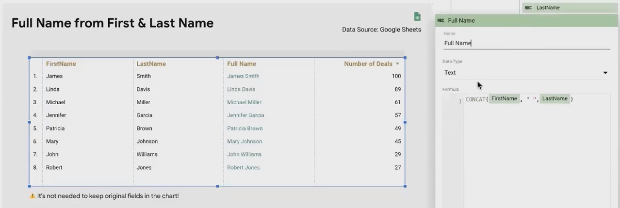 Pro Tip: After creating concatenated fields, you don't need to keep the original fields in your visualization. Remove them to create cleaner, more focused reports.