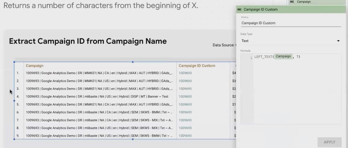 LEFT_TEXT(Campaign, 7)This extracts "1234567" from "1234567 | Google Analytics Demo Campaign"