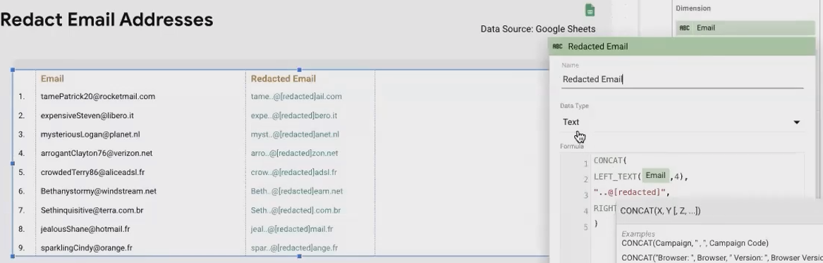 CONCAT(LEFT_TEXT(Email, 4), "..redacted..", RIGHT_TEXT(Email, 7))This transforms "tameka.miller@example.com" into "tame..redacted..ple.com"