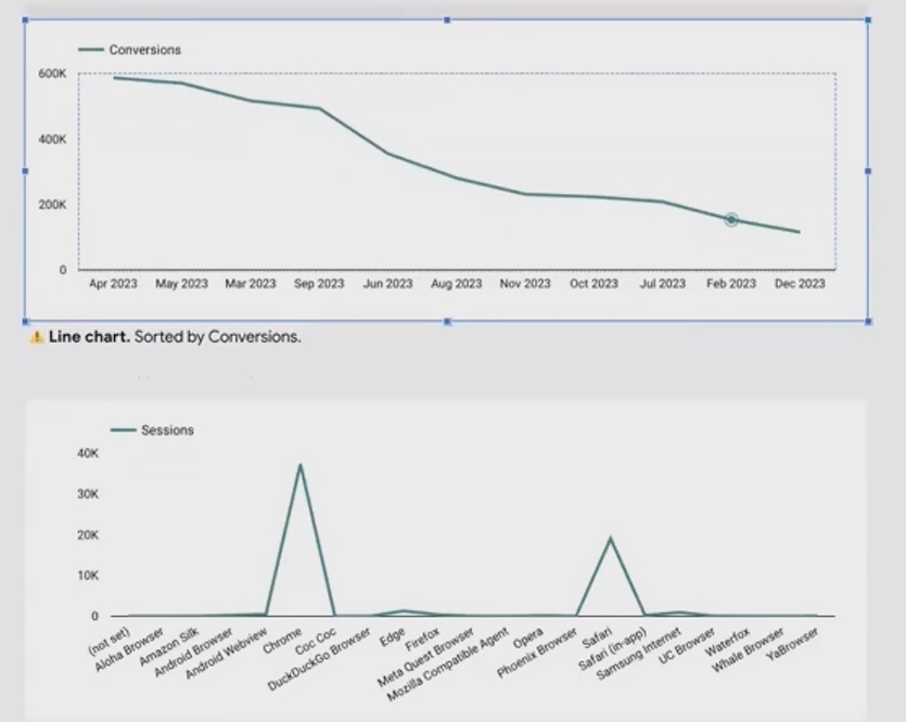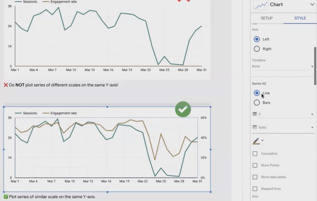 For metrics with vastly different scales (like sessions and conversion rate), plotting them on the same axis would make the smaller-scale metric appear flat. The solution? Use the dual Y-axis feature: