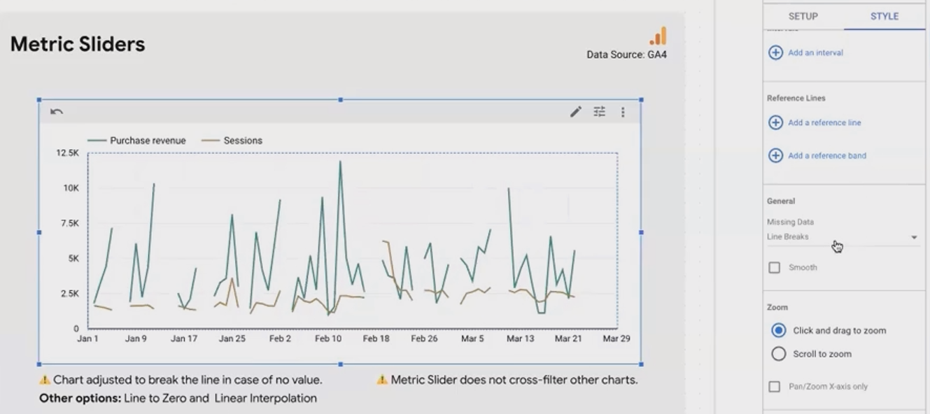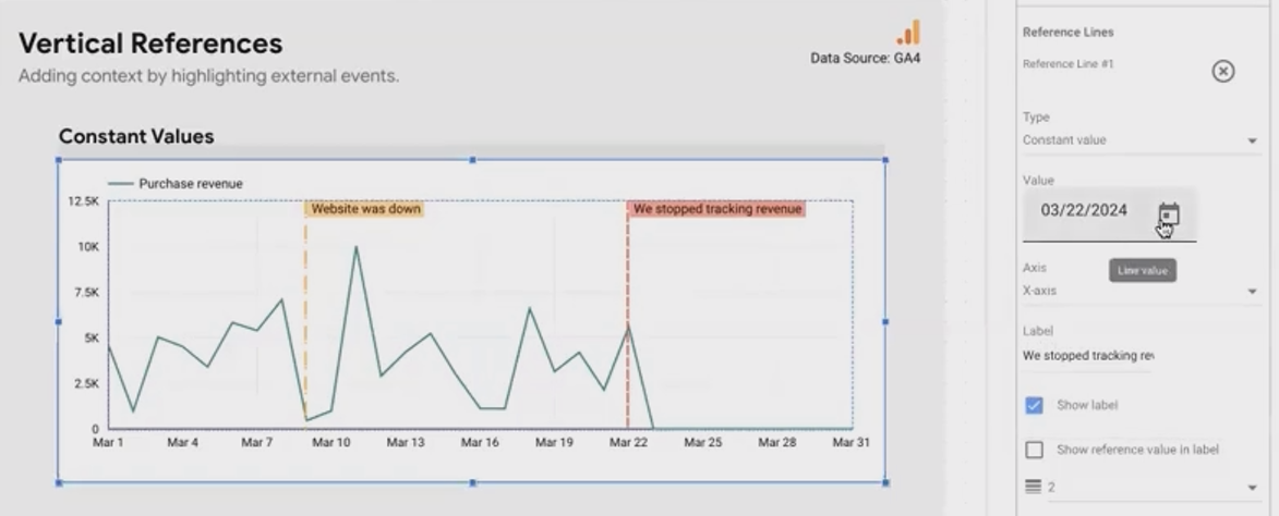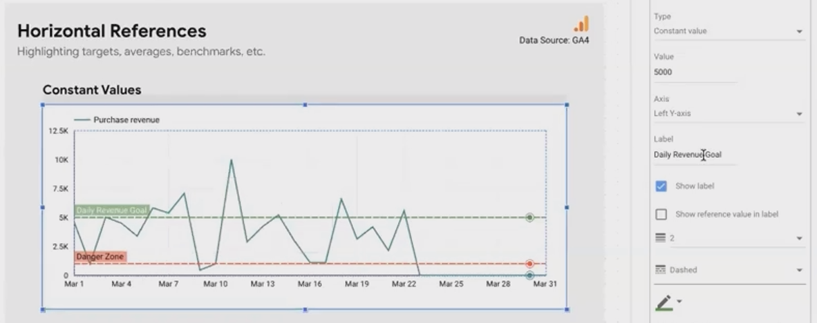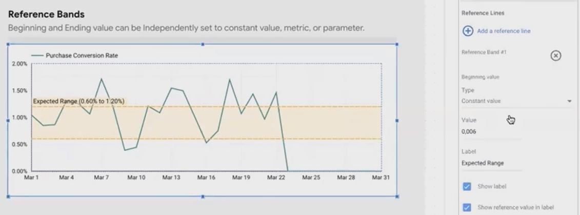Raw data is good, but data with context is better. Looker Studio allows you to add reference lines and bands to your Time Series charts to provide critical context.