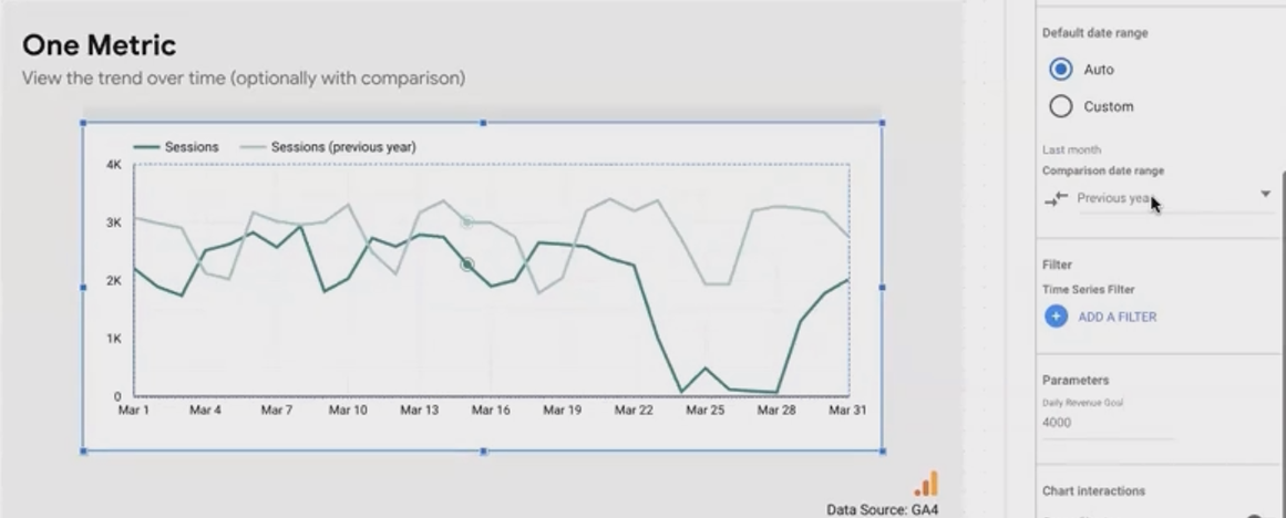 But Looker Studio takes this further by allowing you to add comparison date ranges. Want to see how this month's performance compares to last month? Or this year versus last year? Simply enable the comparison date range option: