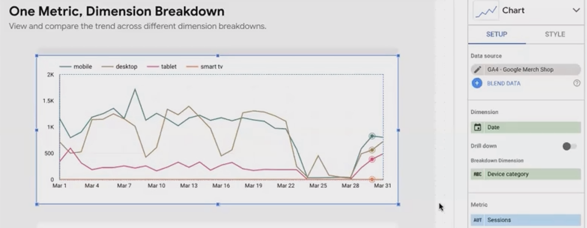 Want to compare how a single metric performs across different categories over time? For example, seeing how sessions trend for mobile, desktop, and tablet users? Time Series charts can do that too!
