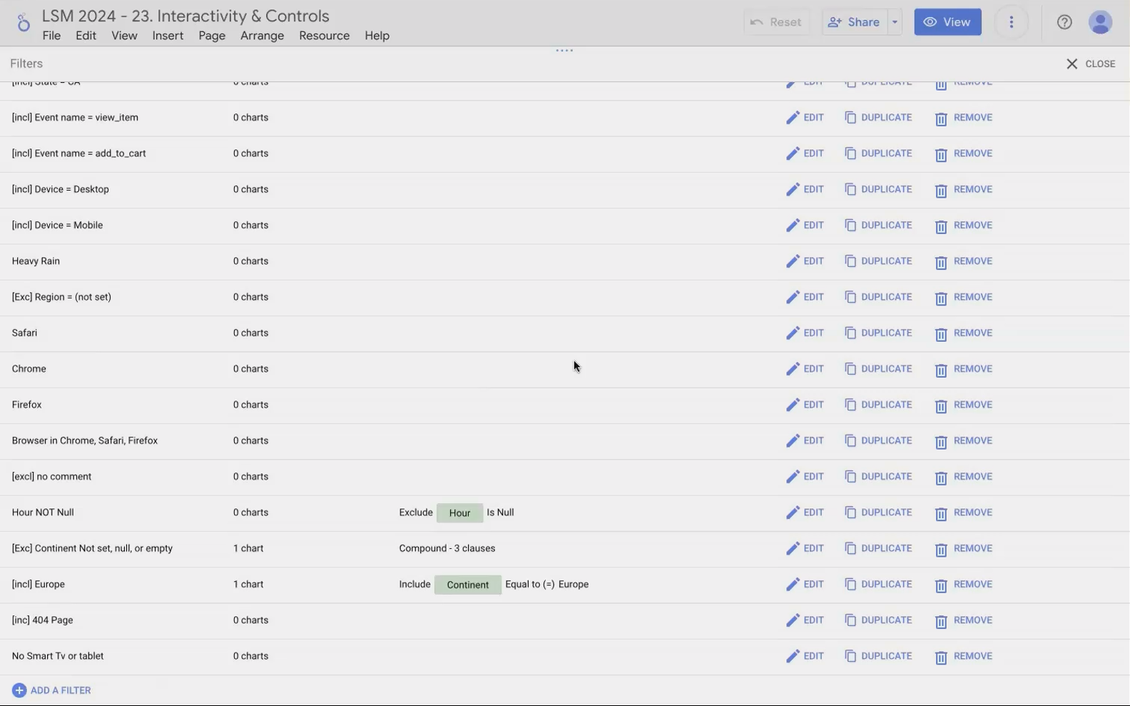 As your reports grow more complex, you'll likely accumulate many filters. Looker Studio provides a central management system to help you keep track of them all.