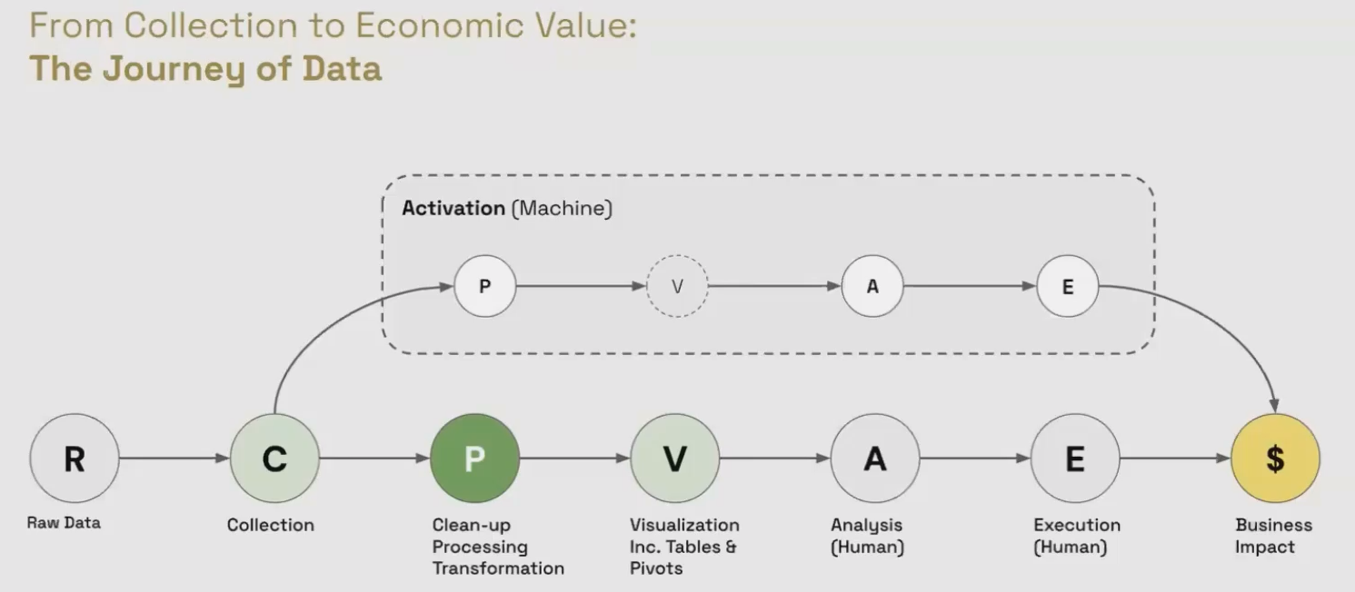 Raw Data β Collection β Cleaning β Machine Analysis β Automated Action β ValueThis is how platforms like Google Ads work, where machines analyze and act on data without human visualization.