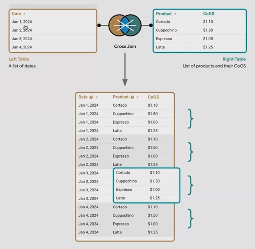 This results in 16 rows (4 dates × 4 products), where each date is paired with each product.